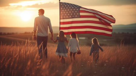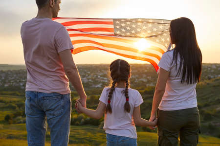 Rear view Family with American moisture in nature at sunset. US Independence Day Celebration July 4th.