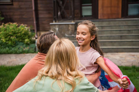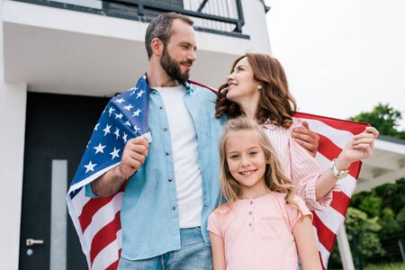 Happy kid near cheerful parents with American flag standing near house