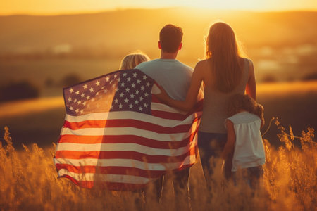 A heartwarming scene of a family enjoying a sunset, holding American flags. This image embodies unity, love, connection, and the spirit of patriotism.