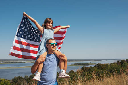 Happy daughter sits on her fathers shoulders and holds the American flag above her head, enjoying nature on a sunny day. Free lifestyle.