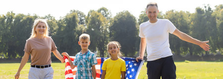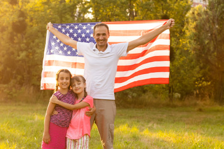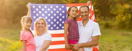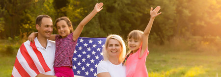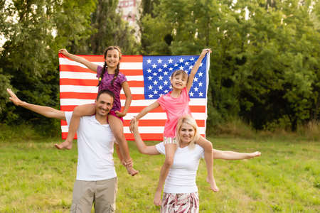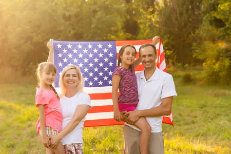 Happy family with usa flag in nature on a sunny summer day