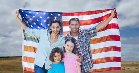 Composition of portrait of smiling caucasian couple with son and daughter holding american flag. united states of america patriotism and independence concept digitally generated image.