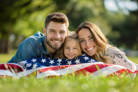 Happy family smiling with an american flag in a park on a sunny day