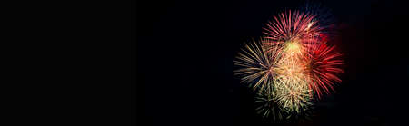 Colorful fireworks on a black background. Celebration and holidays concept. Independence Day 4th of July, New Year, festival. Bright explosions of lights in sky. Place for your text.