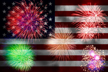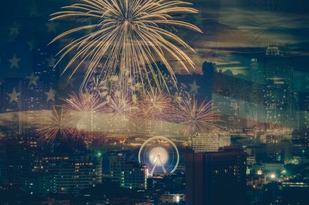 Multicolor Fireworks Celebrate over the United state of America USA flag background and cityscape background, Independence day concept