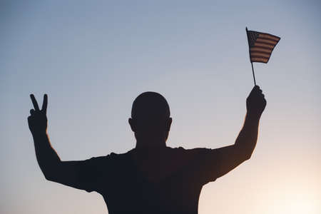 Man holding american USA flag in the sunset. Independence Day or traveling in America concept.