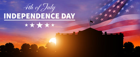 National American flag. USA holiday. White house silhouette on sunset background. 3d illustration