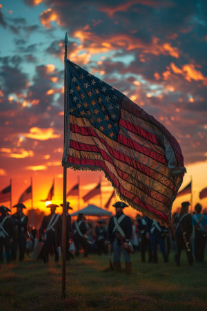 Silhouettes of American soldiers standing in a field at sunset, with the American flag waving in the wind. This image symbolizes patriotism, courage, and sacrifice.