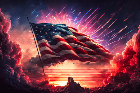 Illustration of flag usa on fireworks background in clouds for Independence Day. Symbol of America. 4th of July. Generative AI