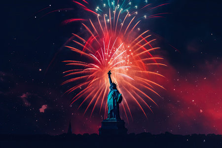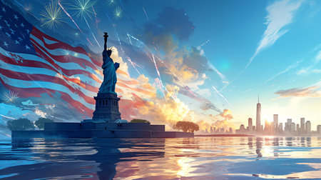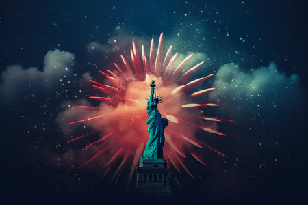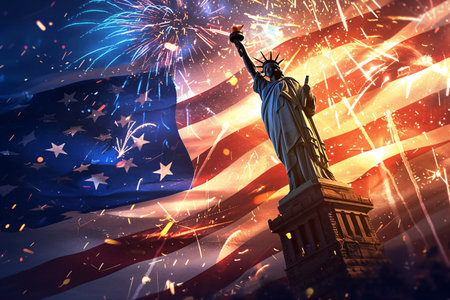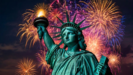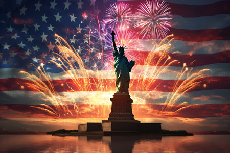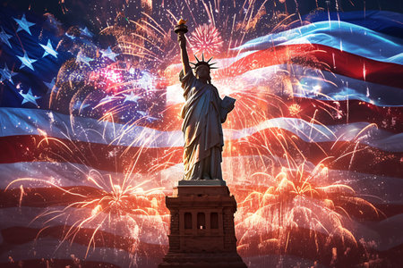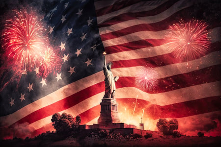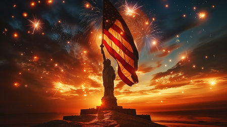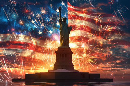 The Statue of Liberty stands proudly in the sky, surrounded by fireworks and an American flag. Its a happy event, a symbol of freedom and art