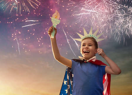 Patriotic holiday. Happy kid, cute little child girl with American flag. USA celebrate 4th of July.