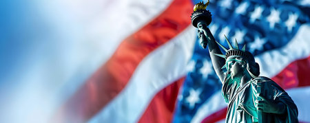 Majestic Statue of Liberty an iconic symbol of freedom and democracy stands tall and proud against the backdrop of a waving American flag on a cloudless blue sky