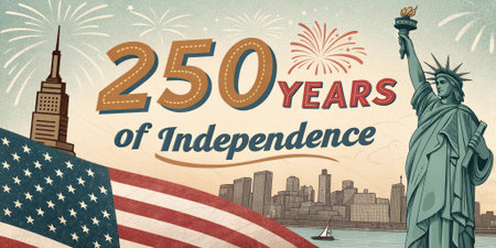 250 years of Independence celebration with USA flag Statue of Liberty fireworks stars and patriotic symbols.