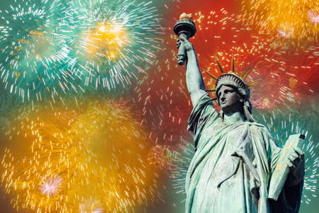 Statue of Liberty in New York City and fireworks. Statue of Liberty over the Multicolor Fireworks. 4th of July and Independence day celebration. American holidays. Independence day in USA celebration