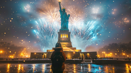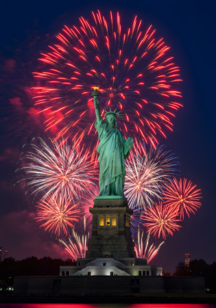 Spectacular pyrotechnics light up the sky above the iconic Statue of Liberty painting the night with vibrant colors and sparkling glitter