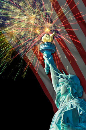 American symbol Statue of Liberty on the background of flag usa and fireworks. Democracy and freedom