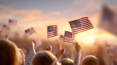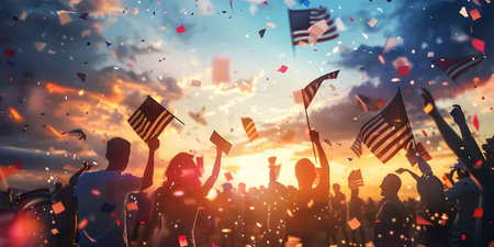 A vibrant crowd joyfully waves American flags during a sunset, capturing the spirit of unity and patriotism in a celebratory outdoor event.
