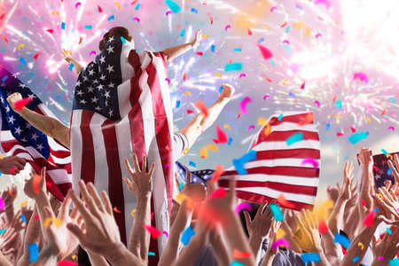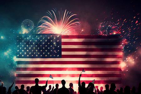 Crowd of people celebrating Independence Day. United States of America USA flag with fireworks background for 4th of July.