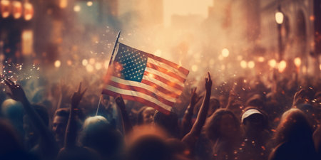 Crowd of people celebrating Independence Day. United States of America USA flag with fireworks background for 4th of July.Generative AI