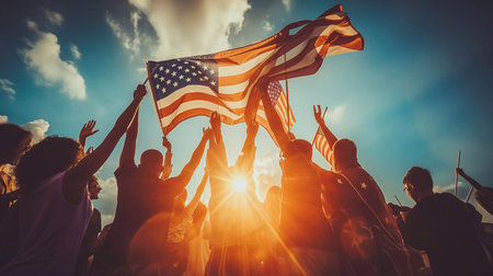 A large crowd of enthusiastic people joyfully holding American flags high up in the air for everyone to see
