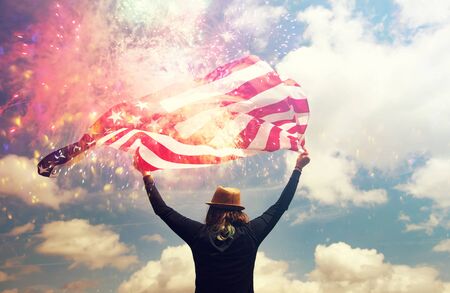 Young happy patriot girl holding the american flag under the 4th of July fireworks.