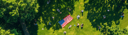 USA flag in the park and people resting nearby top view, created with Generative AI technology