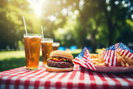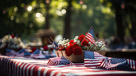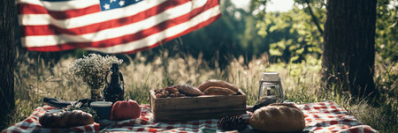 Festive outdoor picnic with patriotic decorations, american food, people enjoying the celebration