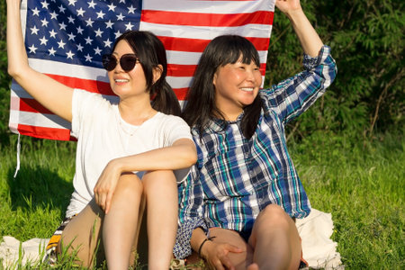 Two smiling asian woman outdoors waving USA flag, celebration of patriotic american national holiday 4th of july independence day, festive picnic on lawn in park