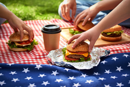 Hands reaching for delicious cheeseburgers and drinks on a checkered picnic blanket with a star-spangled tablecloth.