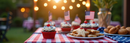 Outdoor table decorated with red, white, and blue cupcakes, star-shaped cookies, and small American flags. Warm string lights and greenery create a festive Fourth of July atmosphere.