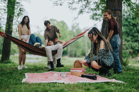 A romantic couple enjoying a picnic in a beautiful green park with friends