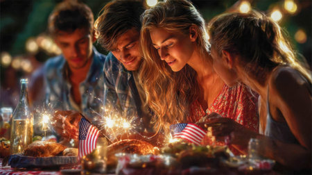 Group of friends celebrating outdoors with sparklers and American flags, enjoying festive summer evening together.