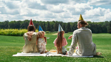 Back view of lovely family wearing party hats, celebrating kids birthday, having picnic in the park on a summer day