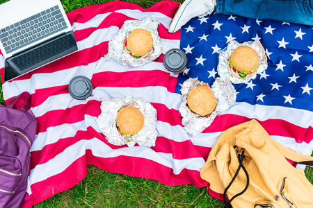 Partial view of man lying near american flag with laptop, burgers and coffee to go on green grass