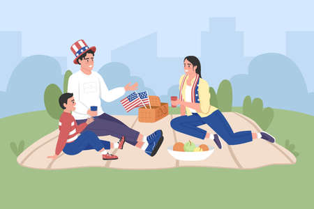 Happy american family celebrate Independence day flat color vector illustration. Picnic on 4th of july in US. Smiling parents with son 2D cartoon characters with urban park on background