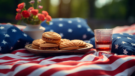 family picnic in a park on the Fourth of July with flags flying. Generative AI