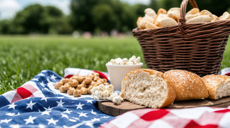 A picnic setup with red, white, and blue decorations featuring bread and snacks