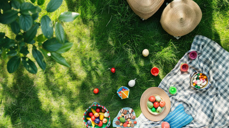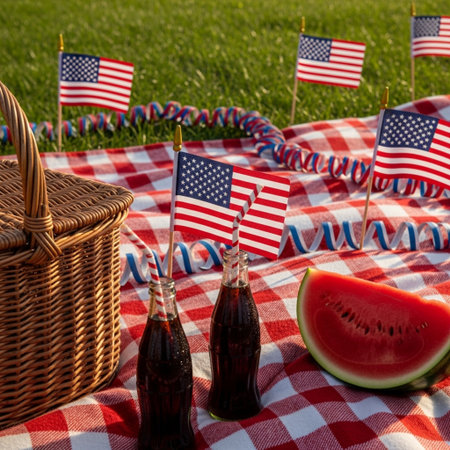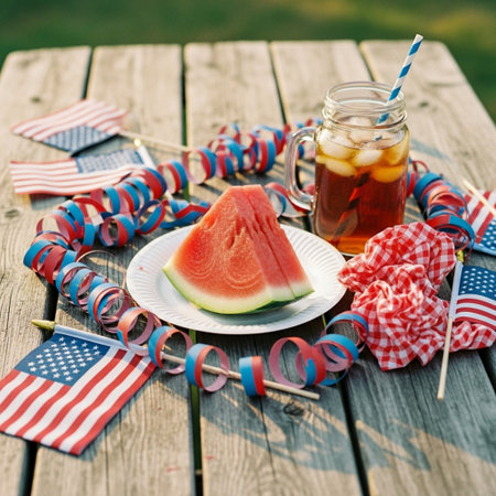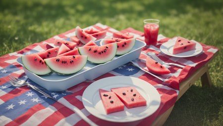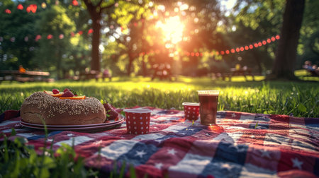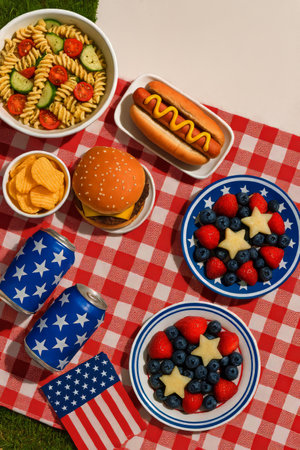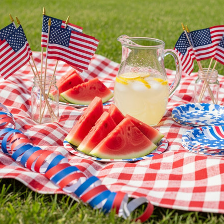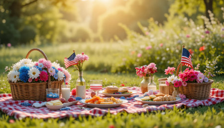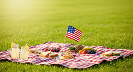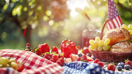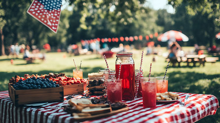 Memorial Day picnic celebration with fresh fruits, delicious snacks, and vibrant decorations in a sunny outdoor setting, festive atmosphere concept