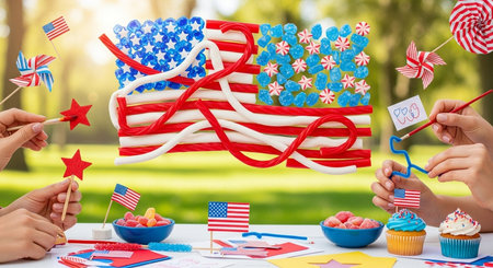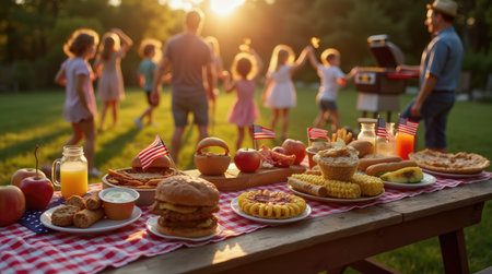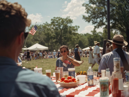 Festive outdoor picnic with patriotic decorations, american food, people enjoying the celebration