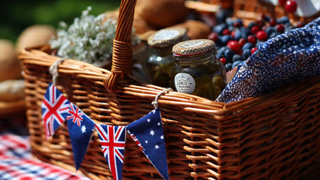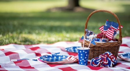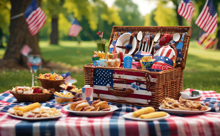 Patriotic picnic in the park with a basket full of food