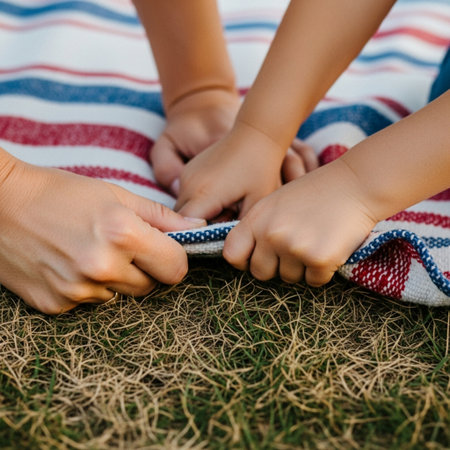 Happy family having a picnic on an american tablecloths