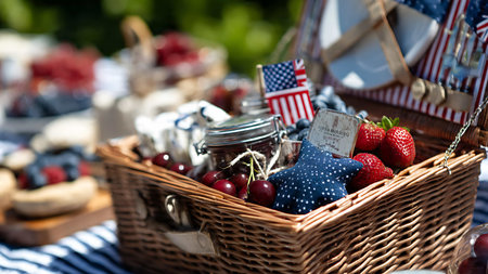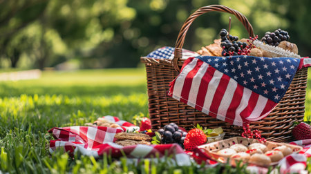 A wicker picnic basket, adorned with an American flag, sits nestled in a lush green grassy park. The basket is overflowing with goodies, including red berries, baked goods, and other treats, all arranged on a red and white checkered tablecloth.