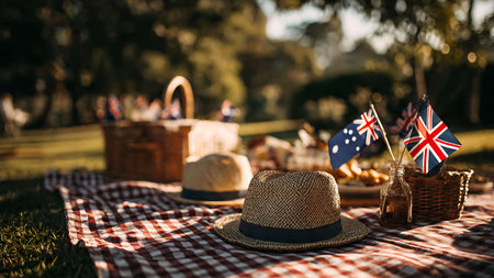 Outdoor Australian celebration with family, flags, and food