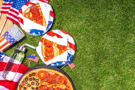 july 4th holiday party pizza, Fourth of July, Patriotic Independence day festive and picnic food. Pepperoni, tomato and black olive pizza with lot of mozzarella, in form of American flag