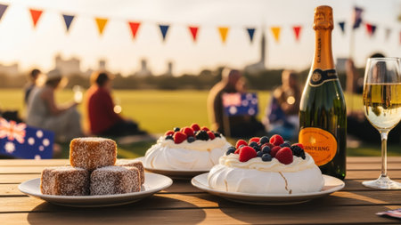 Outdoor celebration with pavlova, lamingtons, champagne, and blurred people