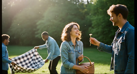 A romantic couple enjoying a picnic in a beautiful green park with friends