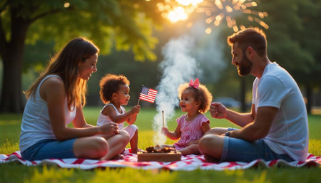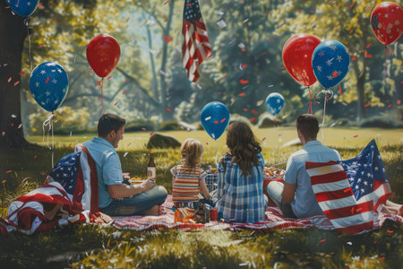 family picnic in a park on the Fourth of July with flags flying. Generative AI