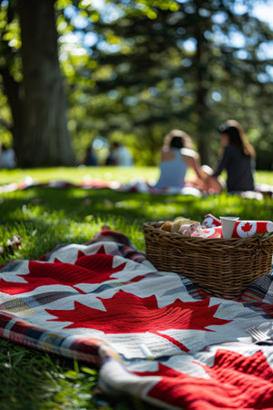 A sunny, relaxing Victoria Day picnic in the park with families, friends, picnic baskets, and Canadian flag-themed blankets.