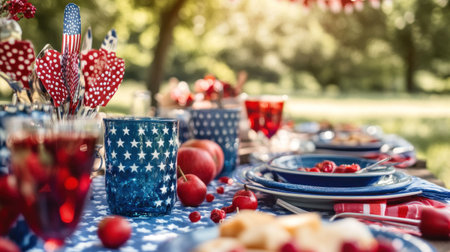 A festive Fourth of July picnic setup with red, white, and blue decorations and tableware