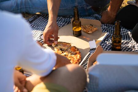 Hand of man taking slice of pizza from box. People gathering around plaid with food and drink, sitting on grass, drinking beer. Eating outdoors concept